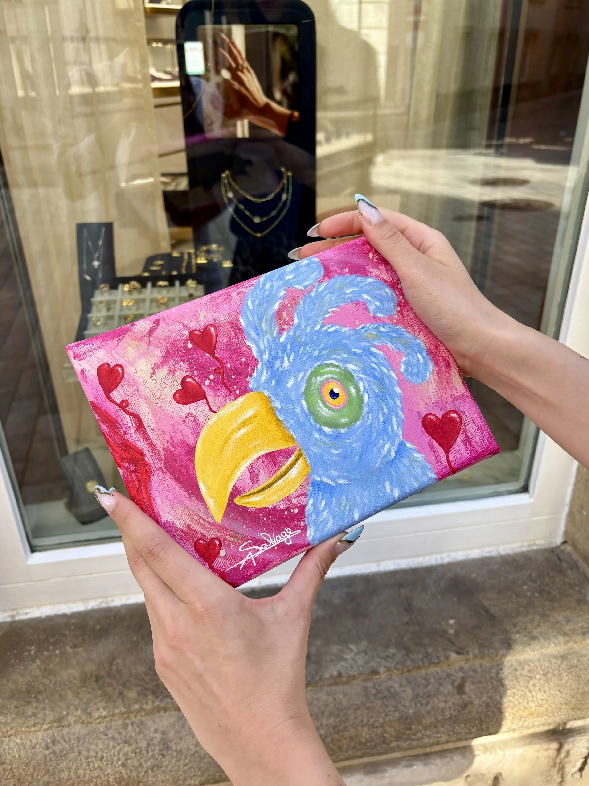 Against a whirlwind of magenta and pink, this bird floats within a cascade of hearts — each one a whispered hope or question. The solitary, expressive eye is alive with longing, capturing the most universal of emotions: vulnerability in pursuit of connection. Its beak, half-open and poised, seems to hover between desire and hesitancy, embodying that brave, fragile instant when we ask, Do you love me?