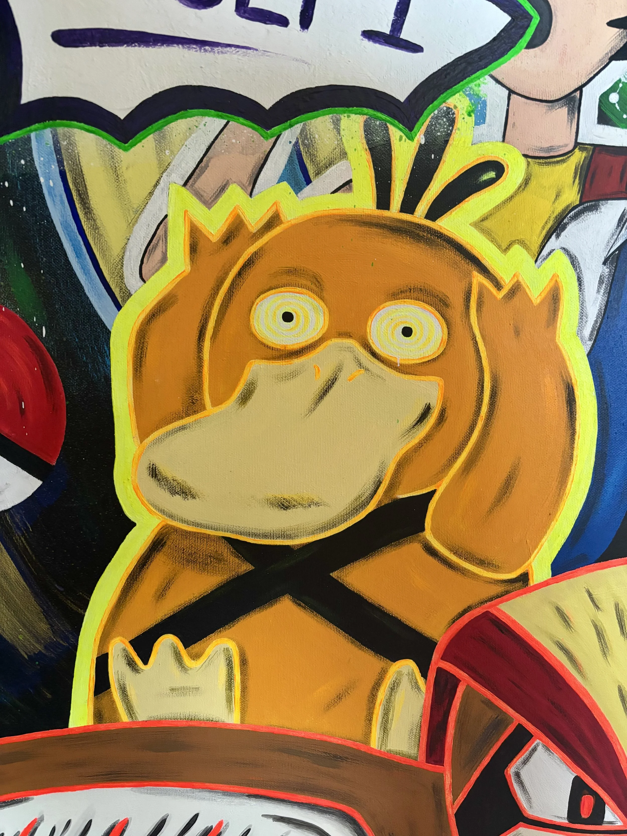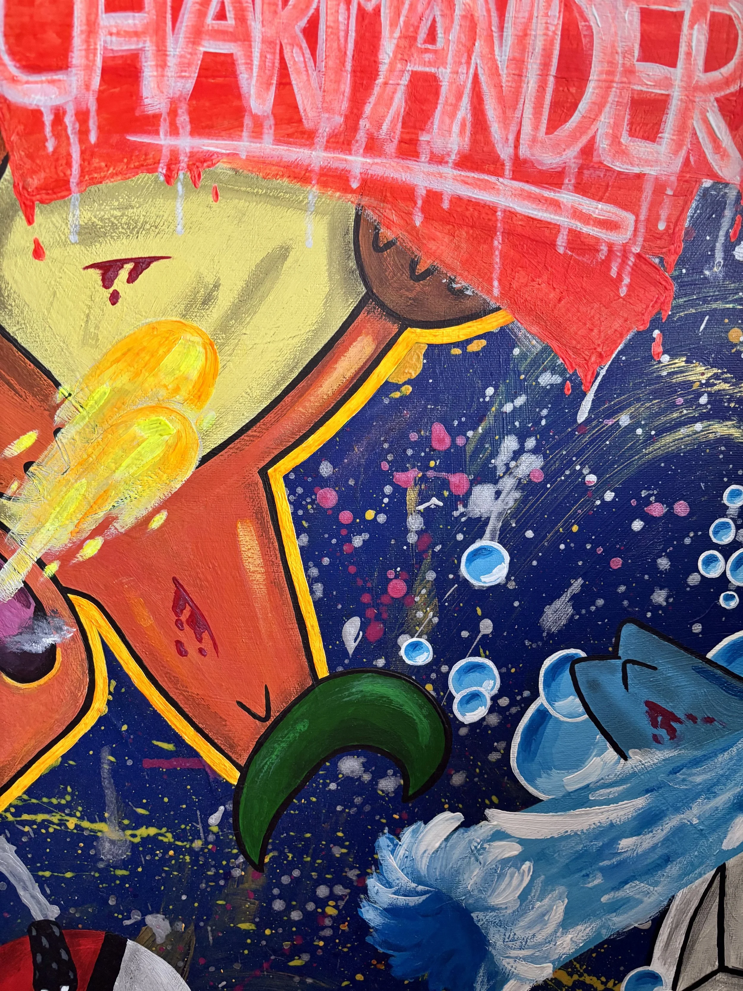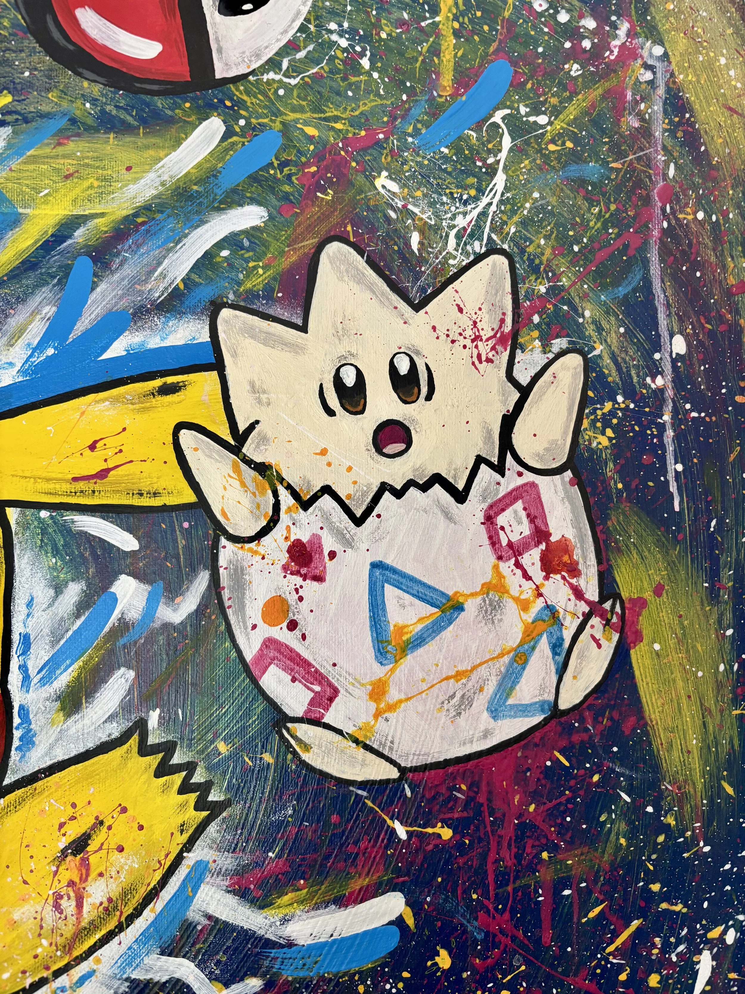 Pikachu and Togepi find themselves trapped in an abstract world filled with strange, colorful filaments and imminent danger. Pikachu bleeds as he desperately tries to rescue his best friend Togepi from the attacking Pokéballs ridden by original antagonists called Viperias. These snake-like creatures are the artist's own creation bringing tension and unpredictability to the universe. This opening piece poses the fundamental question: What would you do to save your best friend?