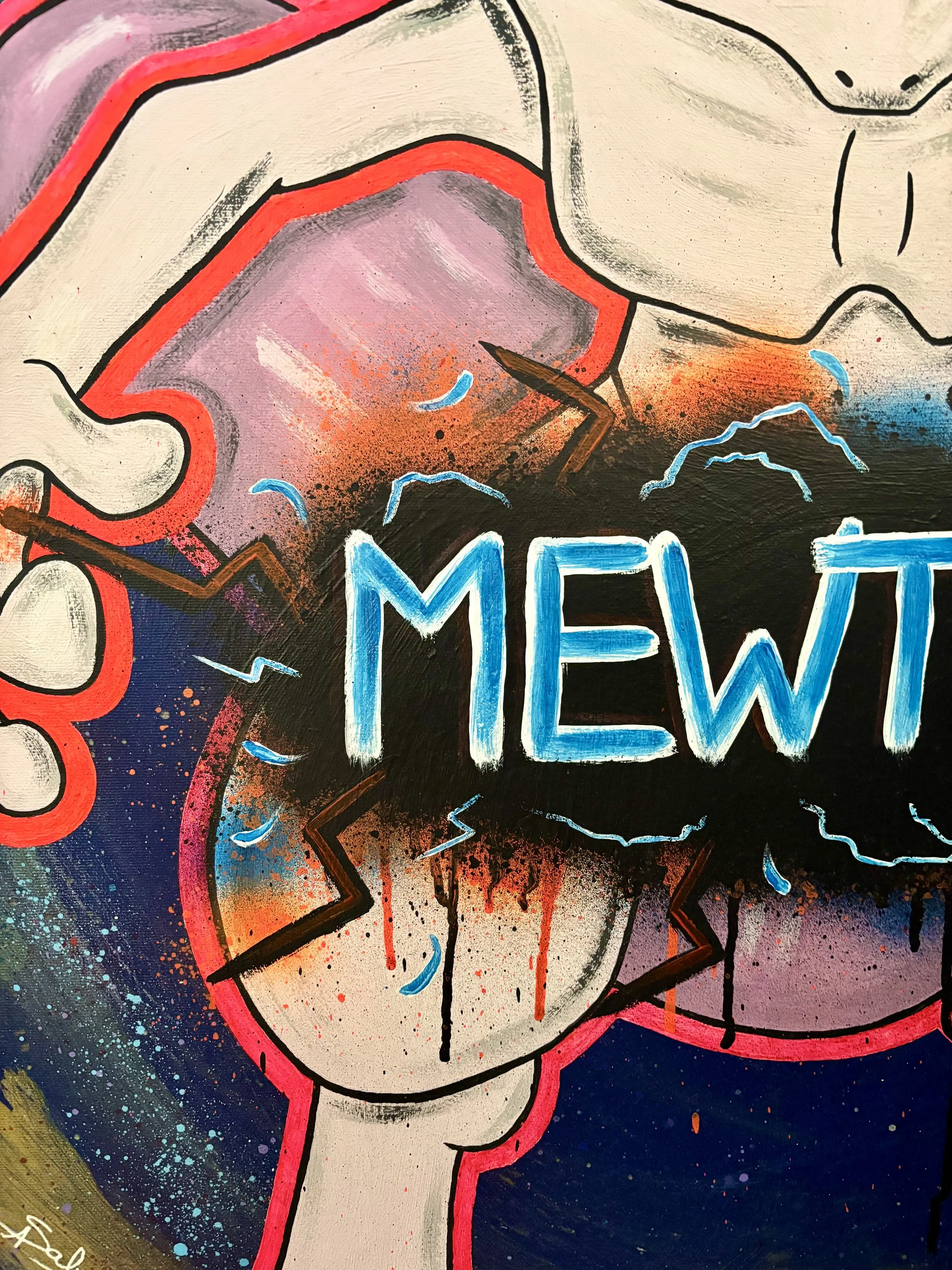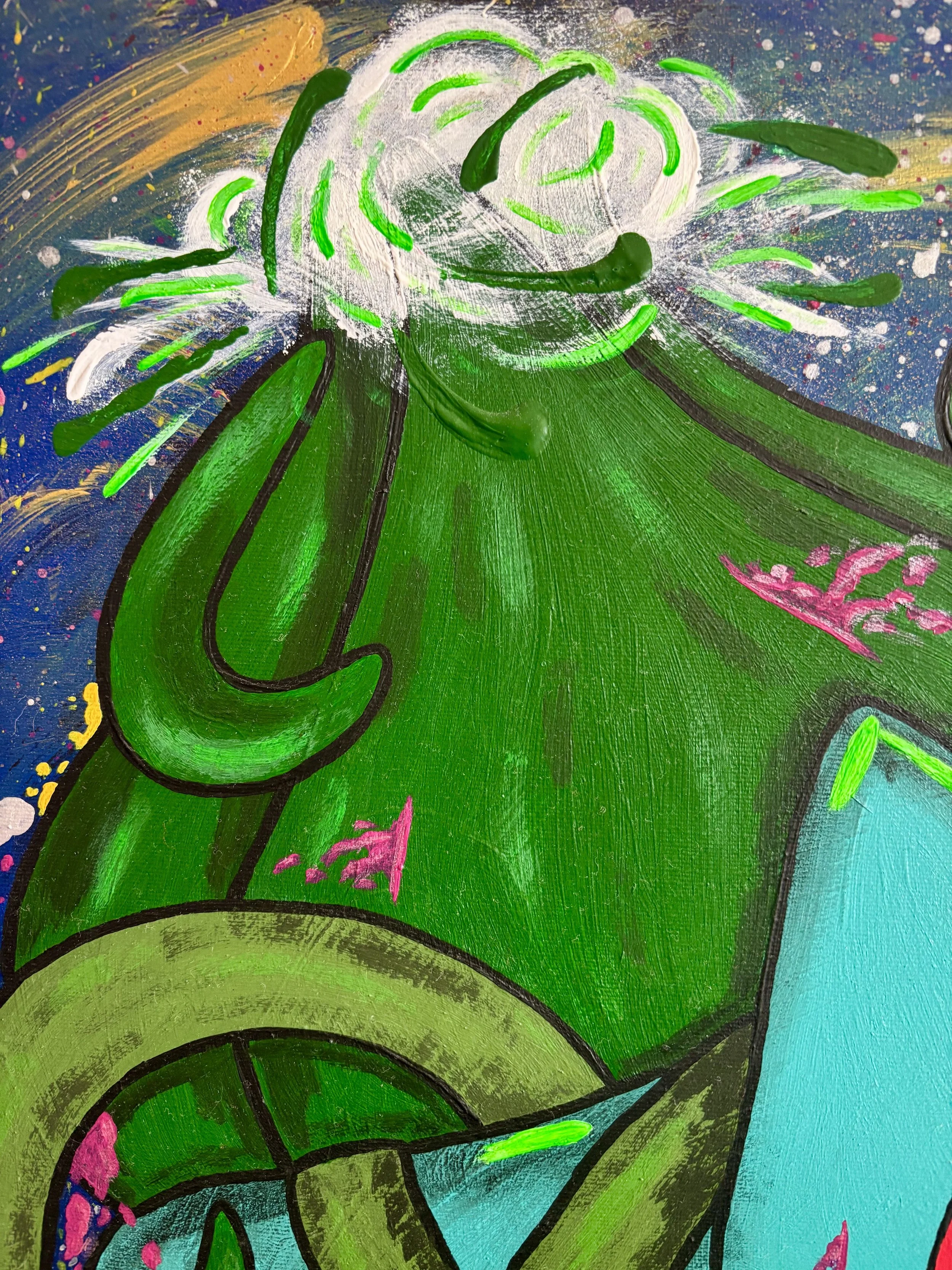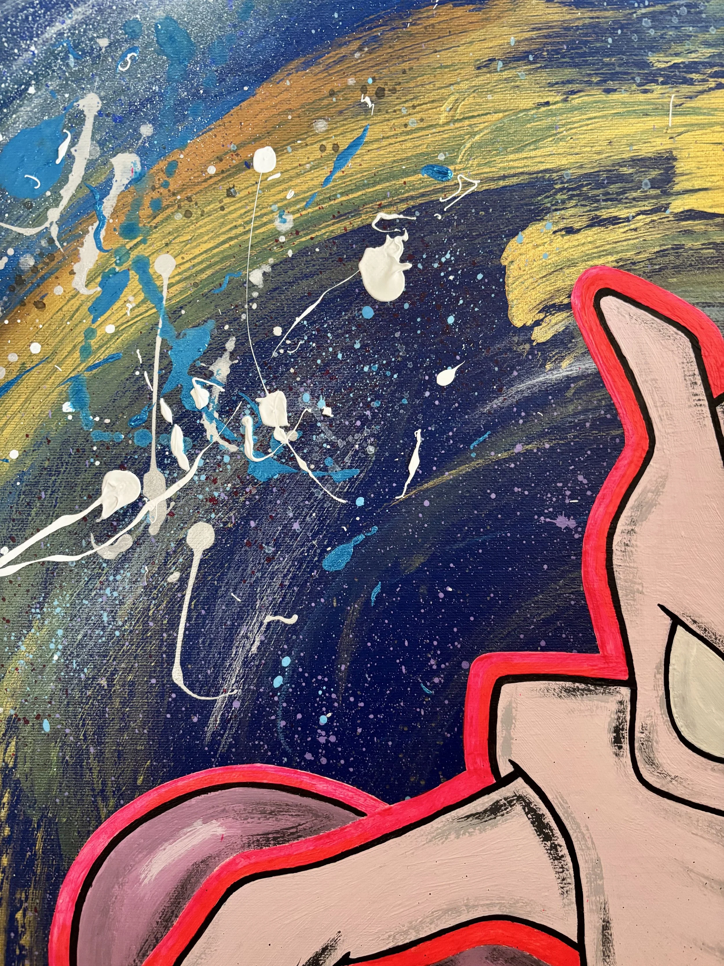 Pikachu and Togepi find themselves trapped in an abstract world filled with strange, colorful filaments and imminent danger. Pikachu bleeds as he desperately tries to rescue his best friend Togepi from the attacking Pokéballs ridden by original antagonists called Viperias. These snake-like creatures are the artist's own creation bringing tension and unpredictability to the universe. This opening piece poses the fundamental question: What would you do to save your best friend?