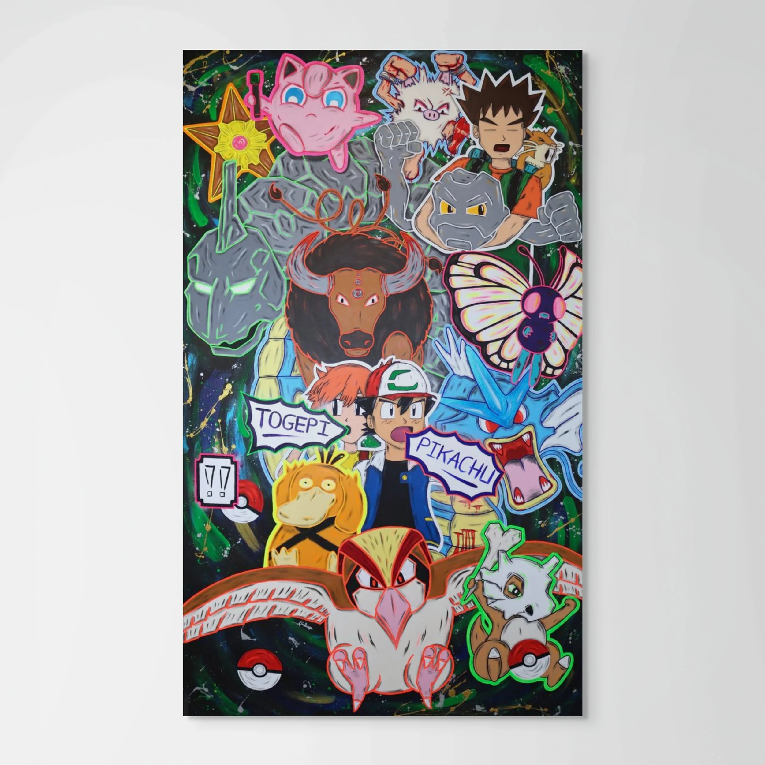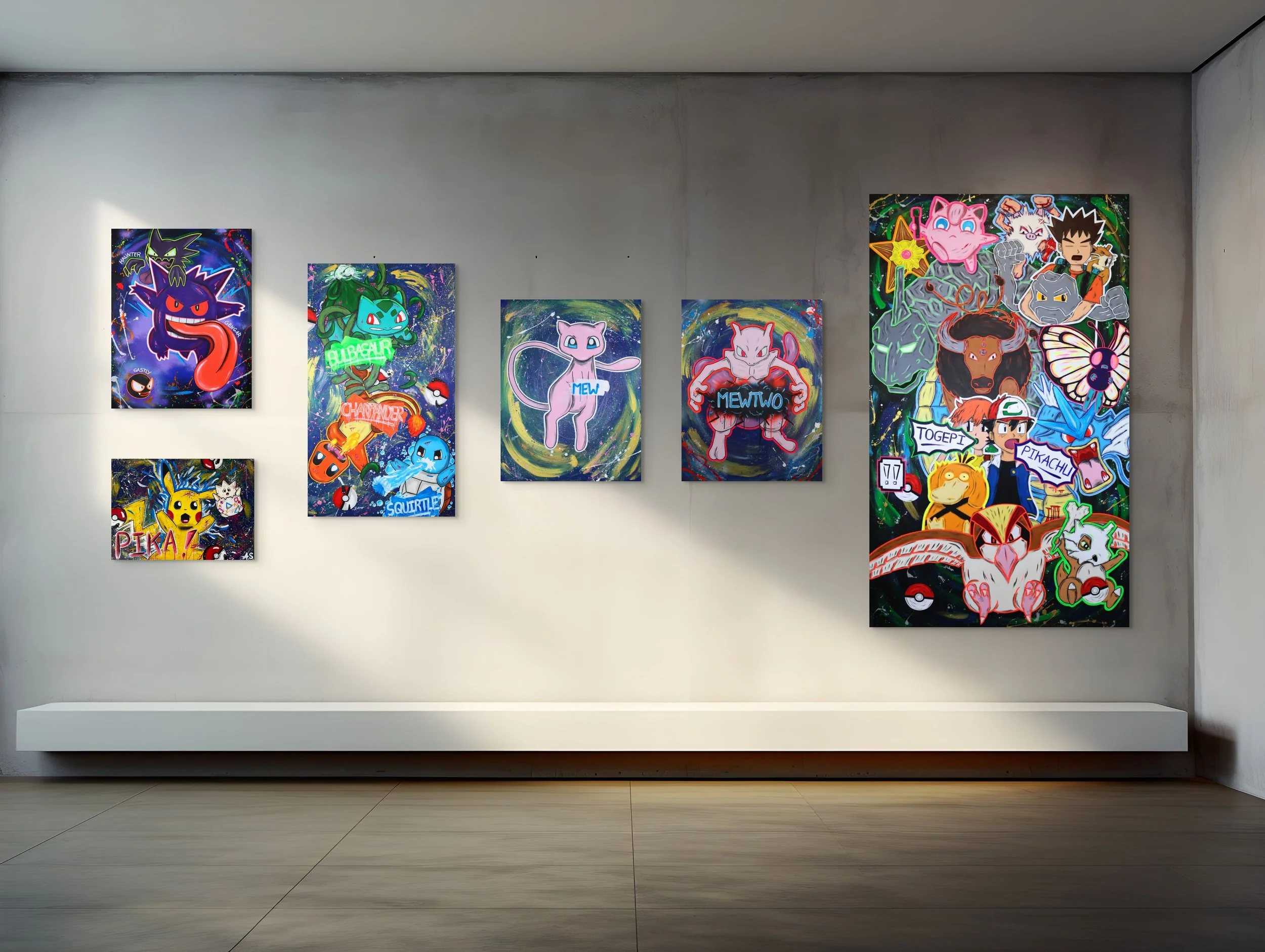 The mathematical precision of featuring exactly 25 characters across the six canvases creates a deliberate symbolic connection to the celebration of the 25th anniversary of Pokemon (2021).
