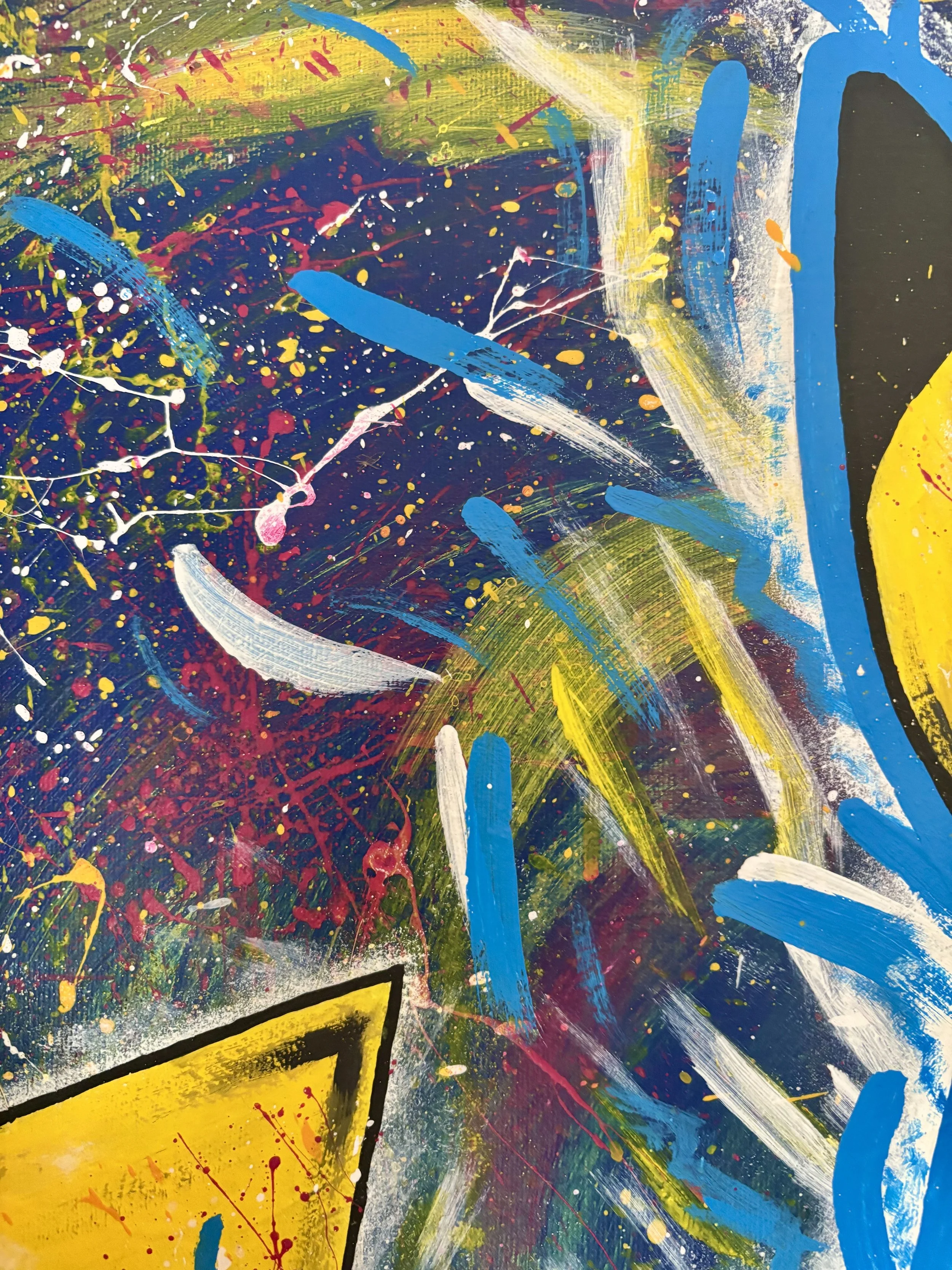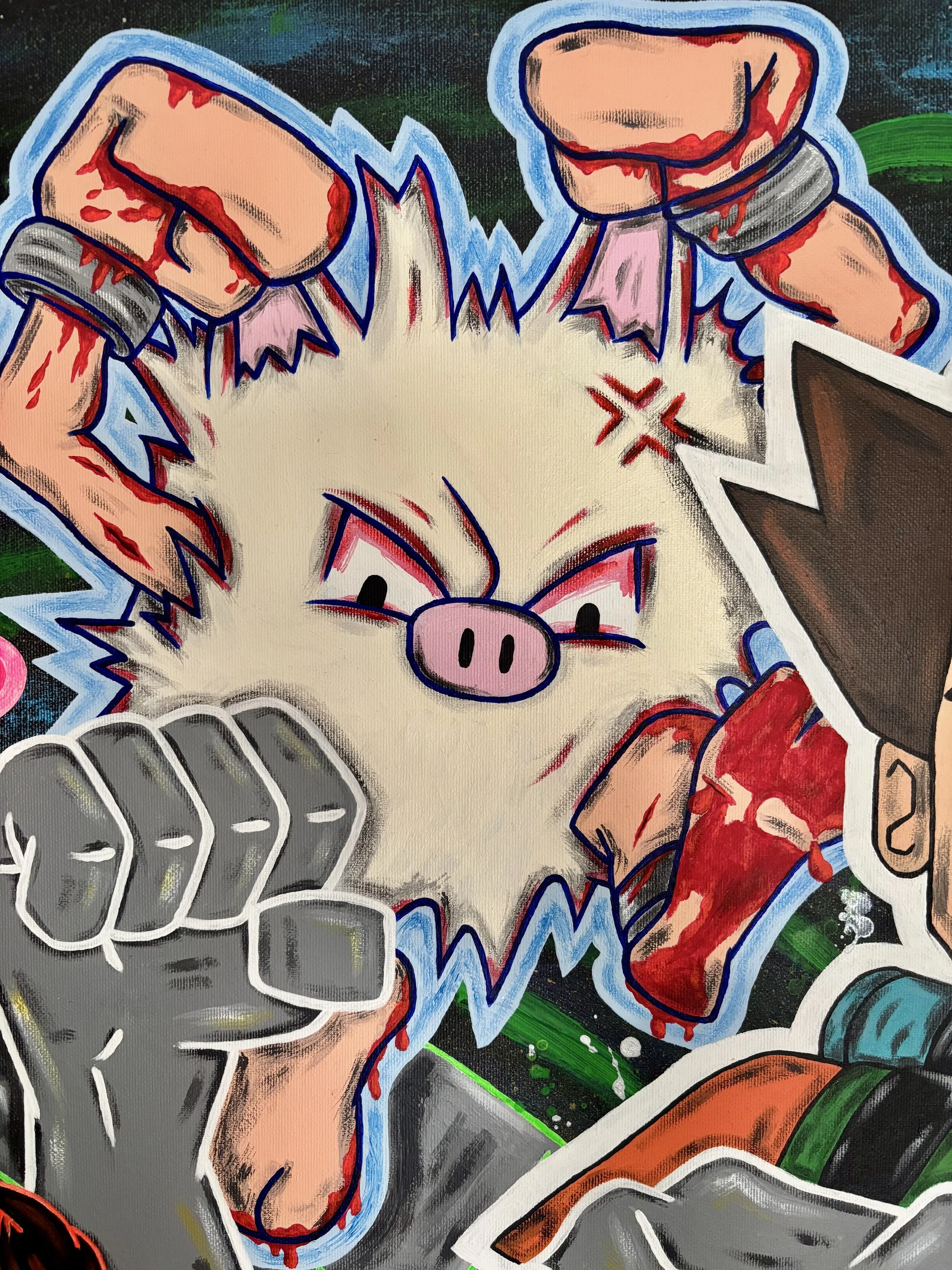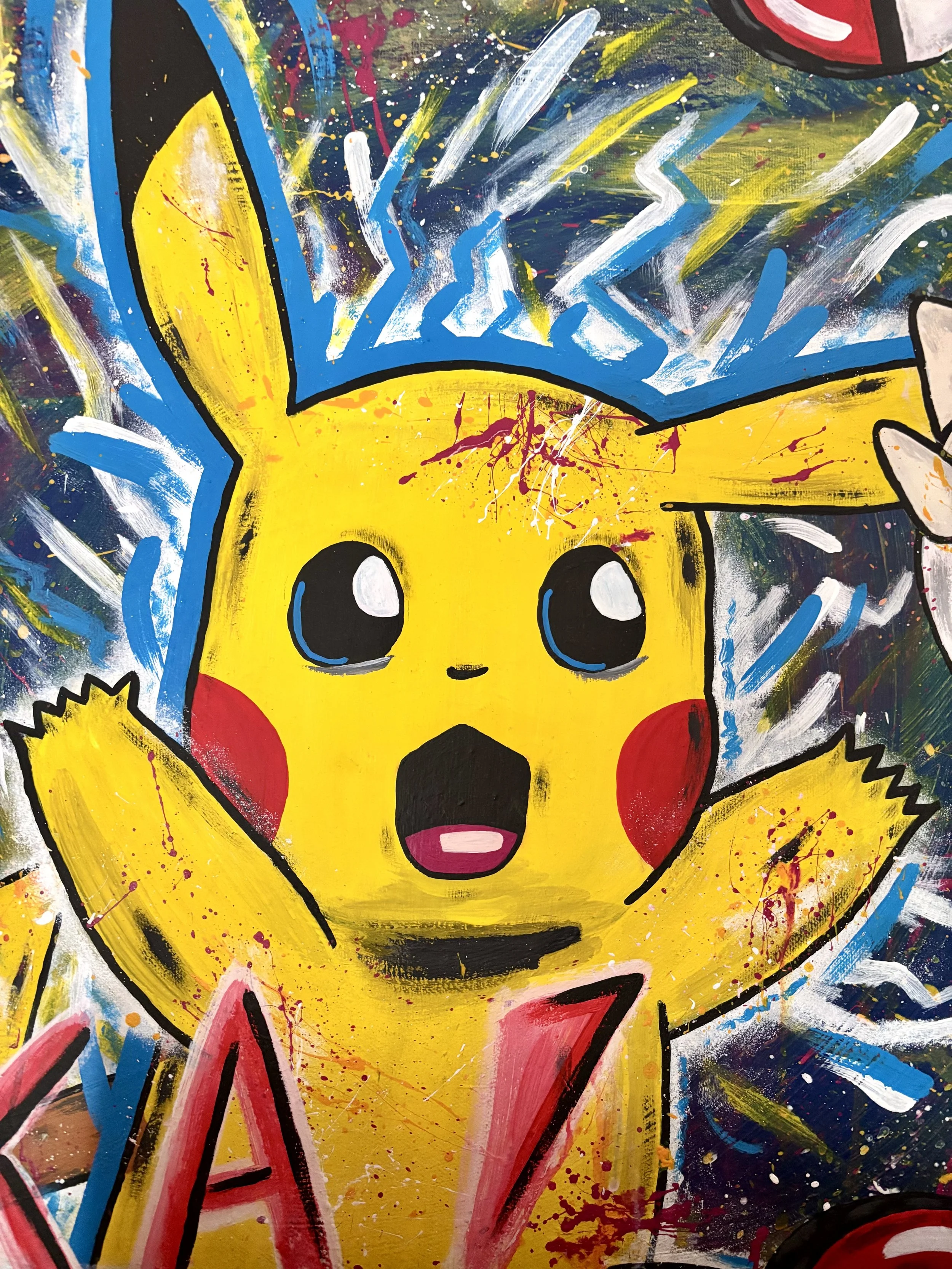 Movement, action, anger, worry, and fear all emerge from this powerful scene. Enhanced with fluorescent paint outlining, the three Pokéballs at the bottom represent additional Pokémon arriving to support the trainers in this climactic rescue mission, completing the circular narrative.