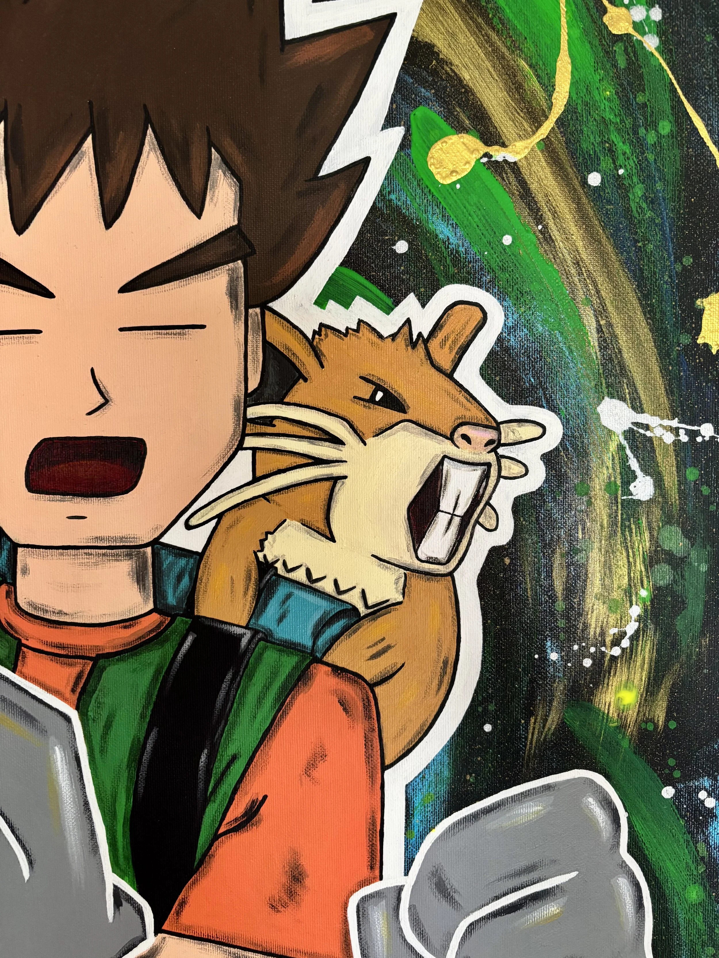 The only painting in the series featuring three evolutions of the same Pokémon line — Gastly, Haunter, and the dominant Gengar with its iconic mischievous grin and extended red tongue. Enhanced with fluorescent paint for maximum impact, these ghost-types inspire both wariness and the thrill of battle.