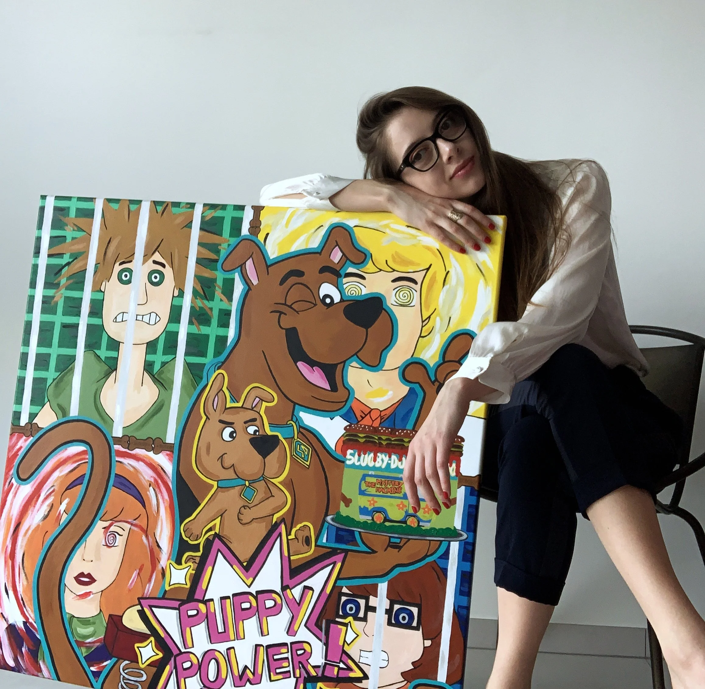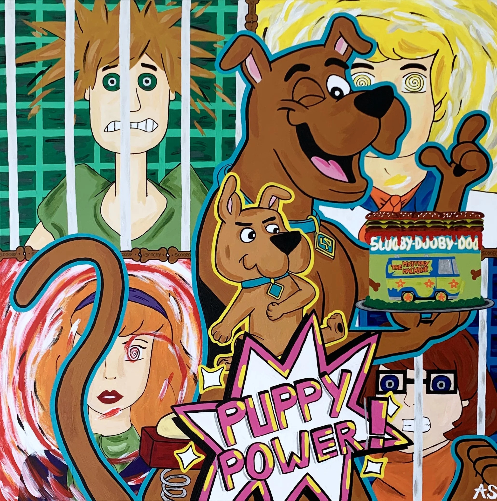 This 100x100cm square composition captures the essence of childhood cartoon logic while exploring themes of greed, friendship, and the triumph of justice over selfishness. Created in 2020 to celebrate the 51st anniversary of Scooby-Doo (1969-2020), this piece demonstrates the artist lifelong appreciation for the franchise while showcasing her ability to reimagine familiar characters in unexpected narrative contexts. The vibrant colors and dynamic composition reflect the energy and humor of the original cartoon while adding layers of storytelling complexity that invite viewers to reconsider the relationships between these iconic characters.